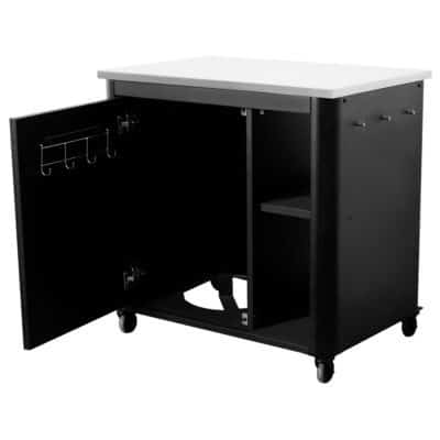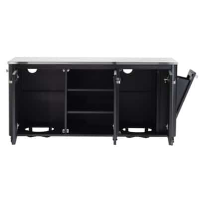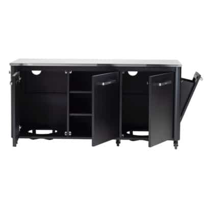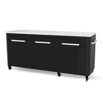 Voor wie op zoek is naar maximale werkruimte en opbergruimte. Deze buitenkeuken heeft een grote werkbank met drie deuren en opklapbare tafels, een hoekmodule en extra legplanken.