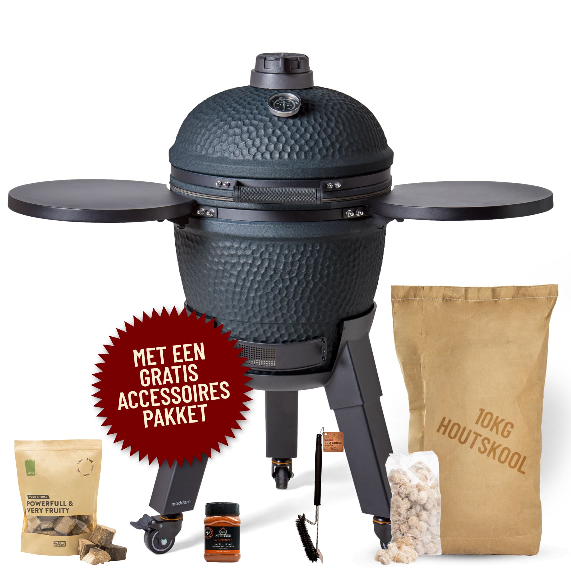 Maar dat is nog niet alles! De Moddern Royal Blue Complete wordt standaard geleverd met een aantal mooie must-haves, waardoor je meteen gereed bent voor elke barbecue-uitdaging!