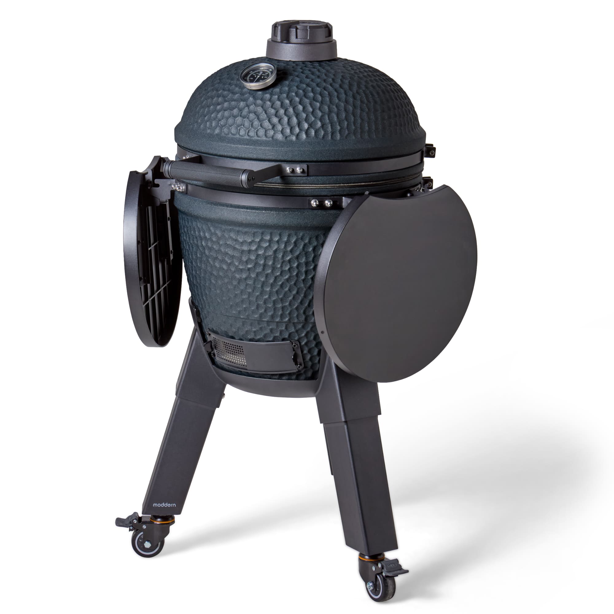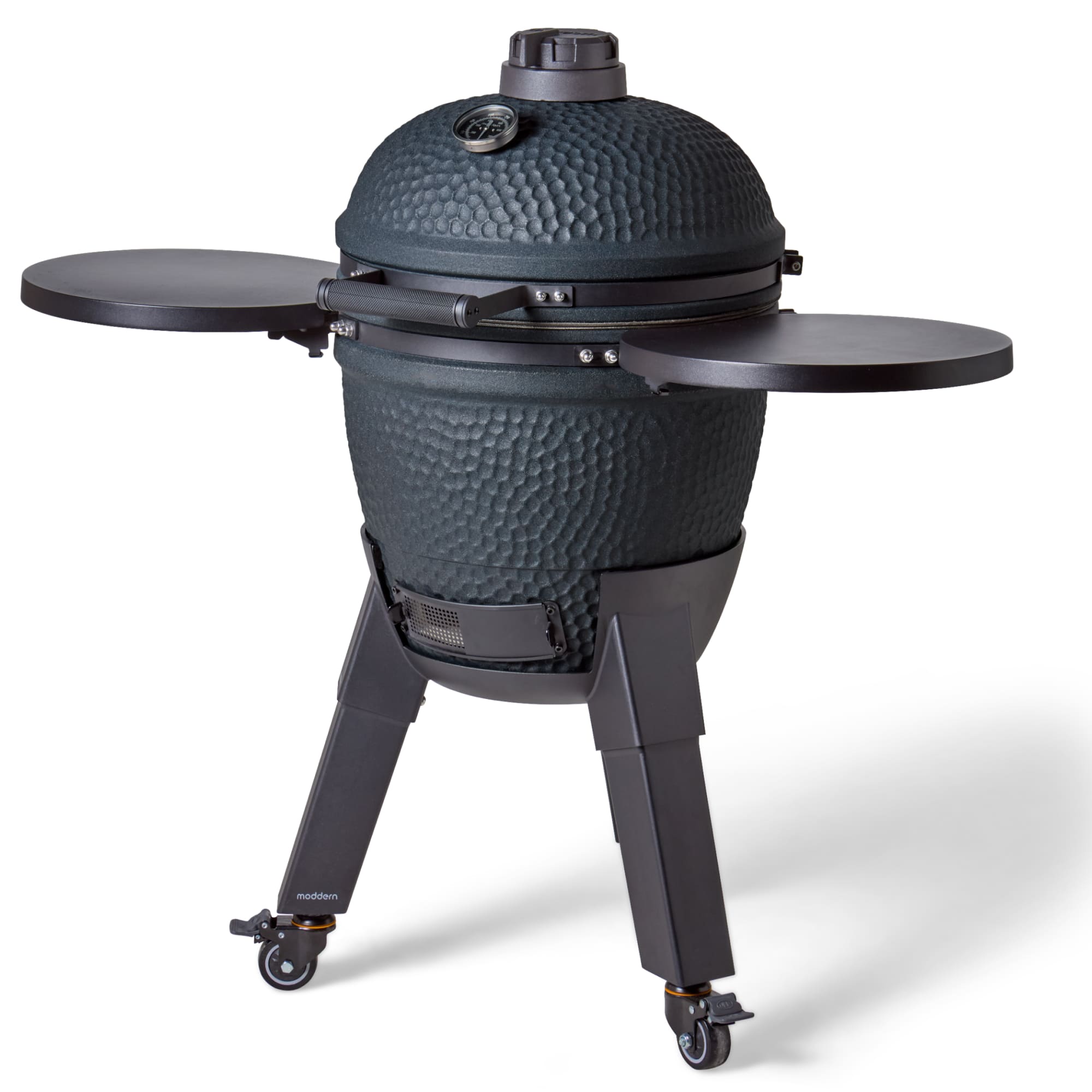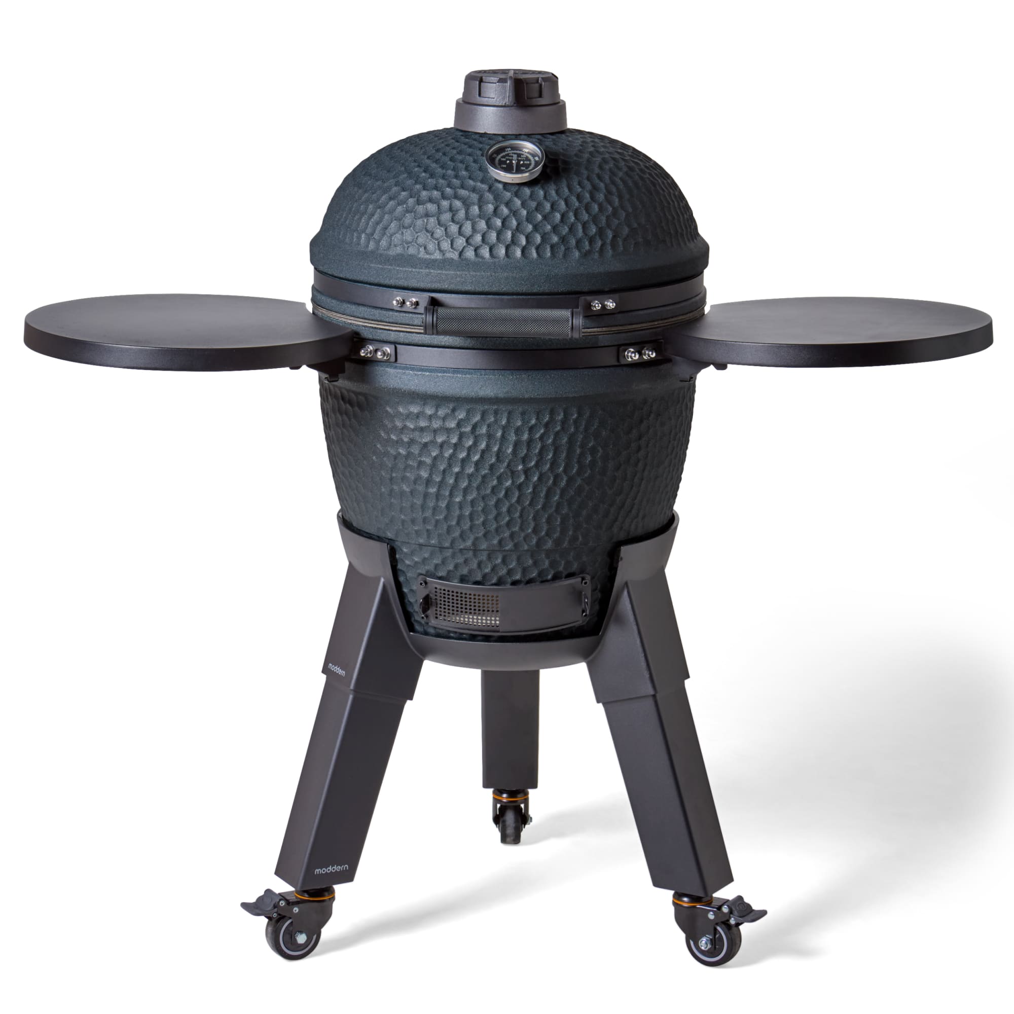 Deze uitvoering staat op zwarte aluminium poten en is voorzien van bijpassende zijtafels. Dit zorgt voor een strak en modern geheel dat perfect aansluit bij de diepe Royal Blue kleur. De wielen maken het mogelijk om de kamado eenvoudig te verplaatsen, terwijl de zijtafels extra werkruimte bieden.