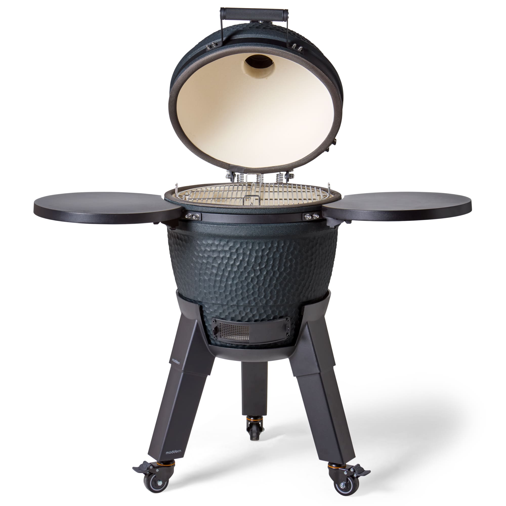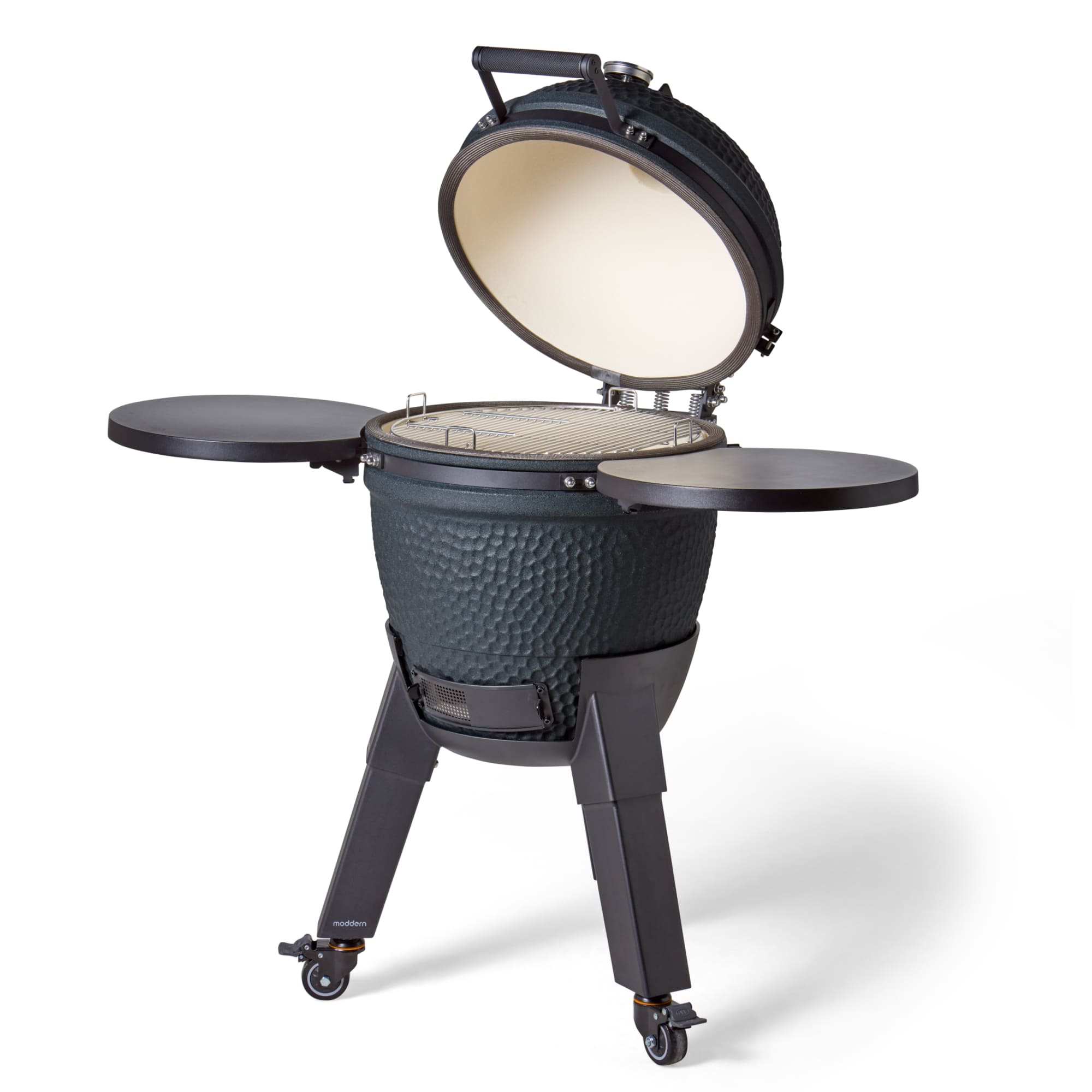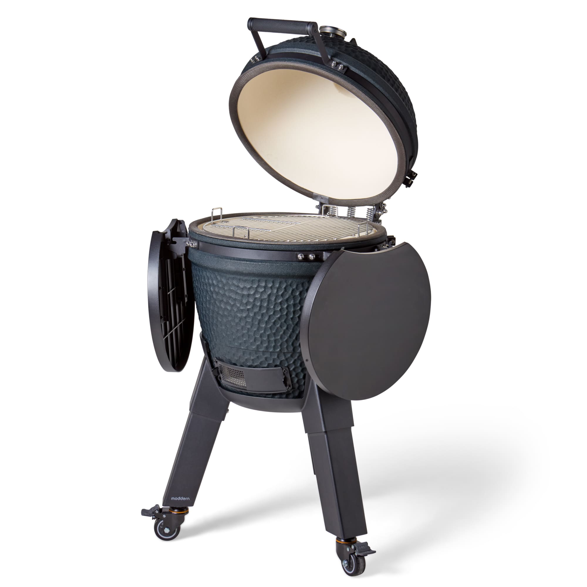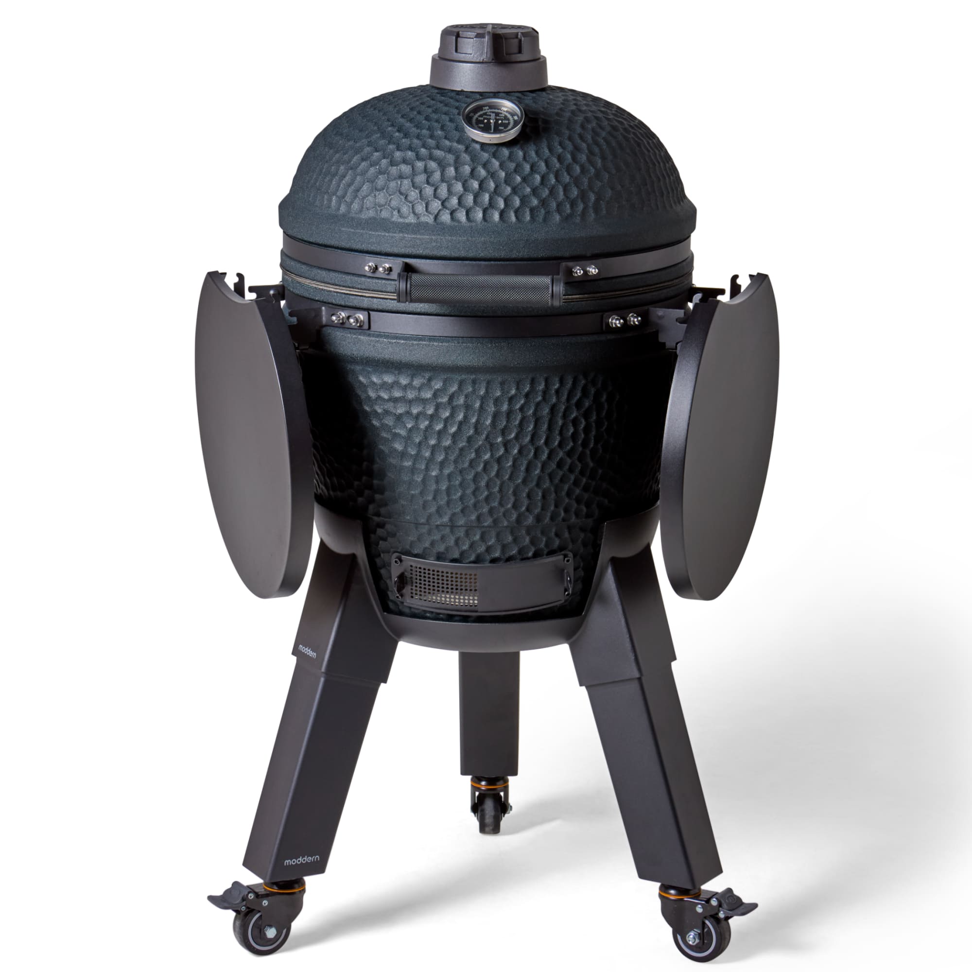 Deze uitvoering staat op zwarte aluminium poten en is voorzien van bijpassende zijtafels. Dit zorgt voor een strak en modern geheel dat perfect aansluit bij de diepe Royal Blue kleur. De wielen maken het mogelijk om de kamado eenvoudig te verplaatsen, terwijl de zijtafels extra werkruimte bieden.
