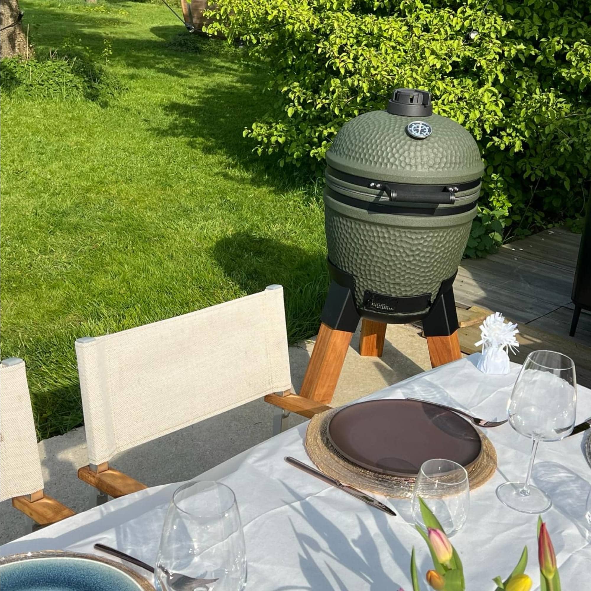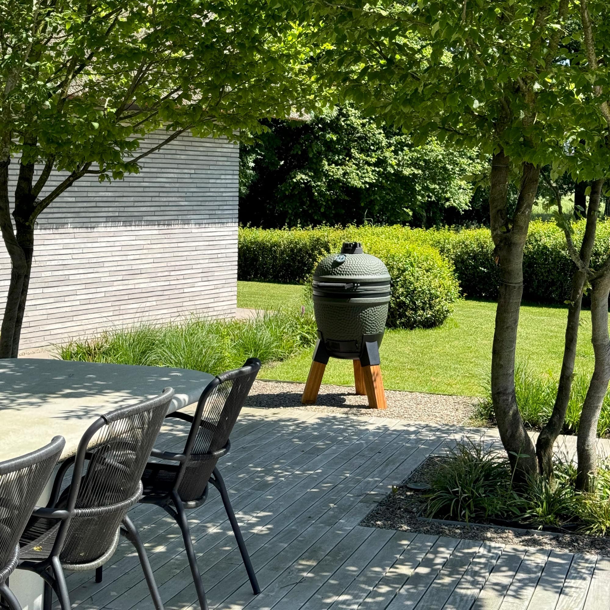 De matgroene keramische behuizing combineert moeiteloos met het warme karakter van het tropische hardhout. Het resultaat is een kamado met een ambachtelijke, verfijnde uitstraling die naadloos opgaat in elke tuin of buitenkeuken. Geen wielen, geen zijtafels, geen overdaad. Alleen een stabiele basis en een ontwerp dat rust en karakter uitstraalt.
