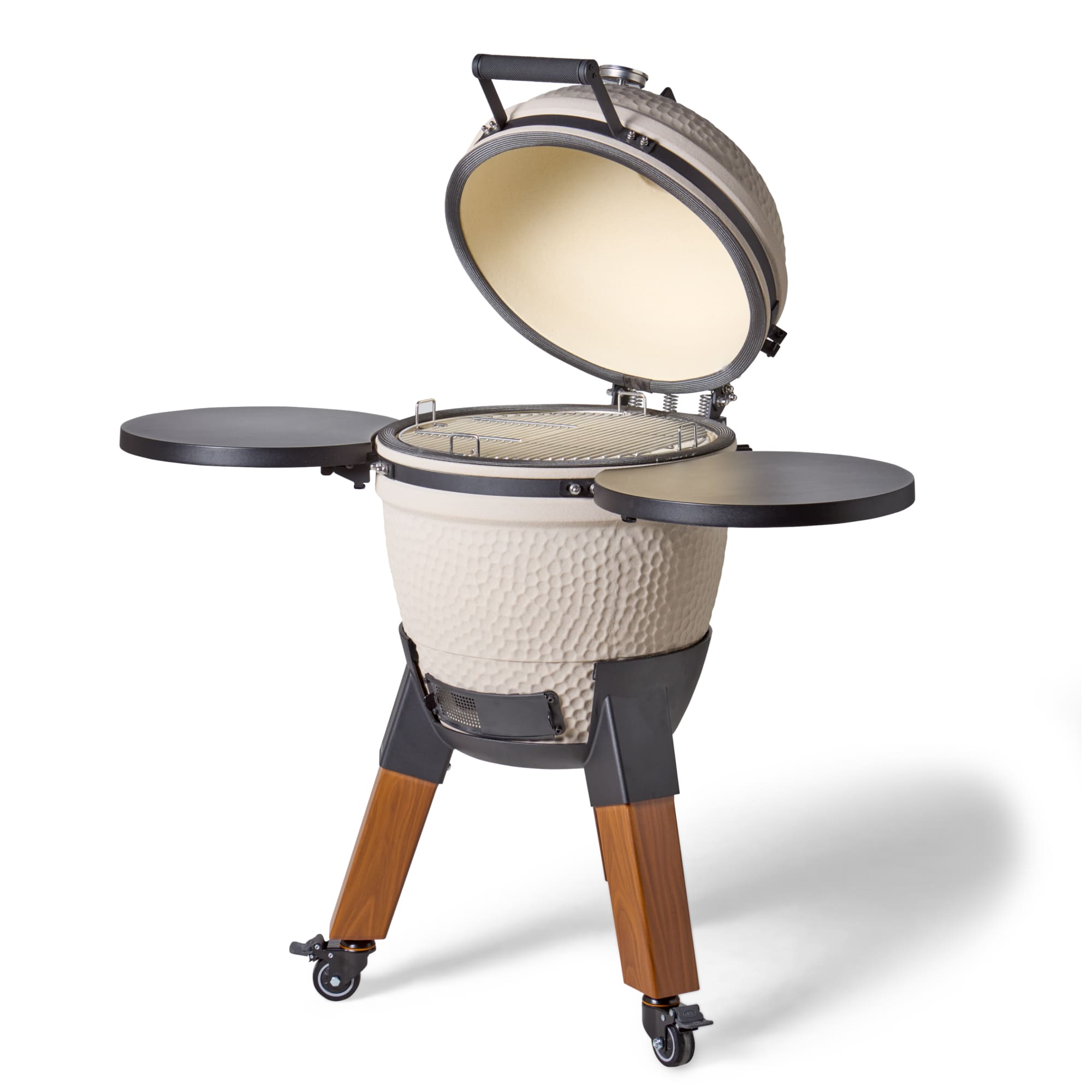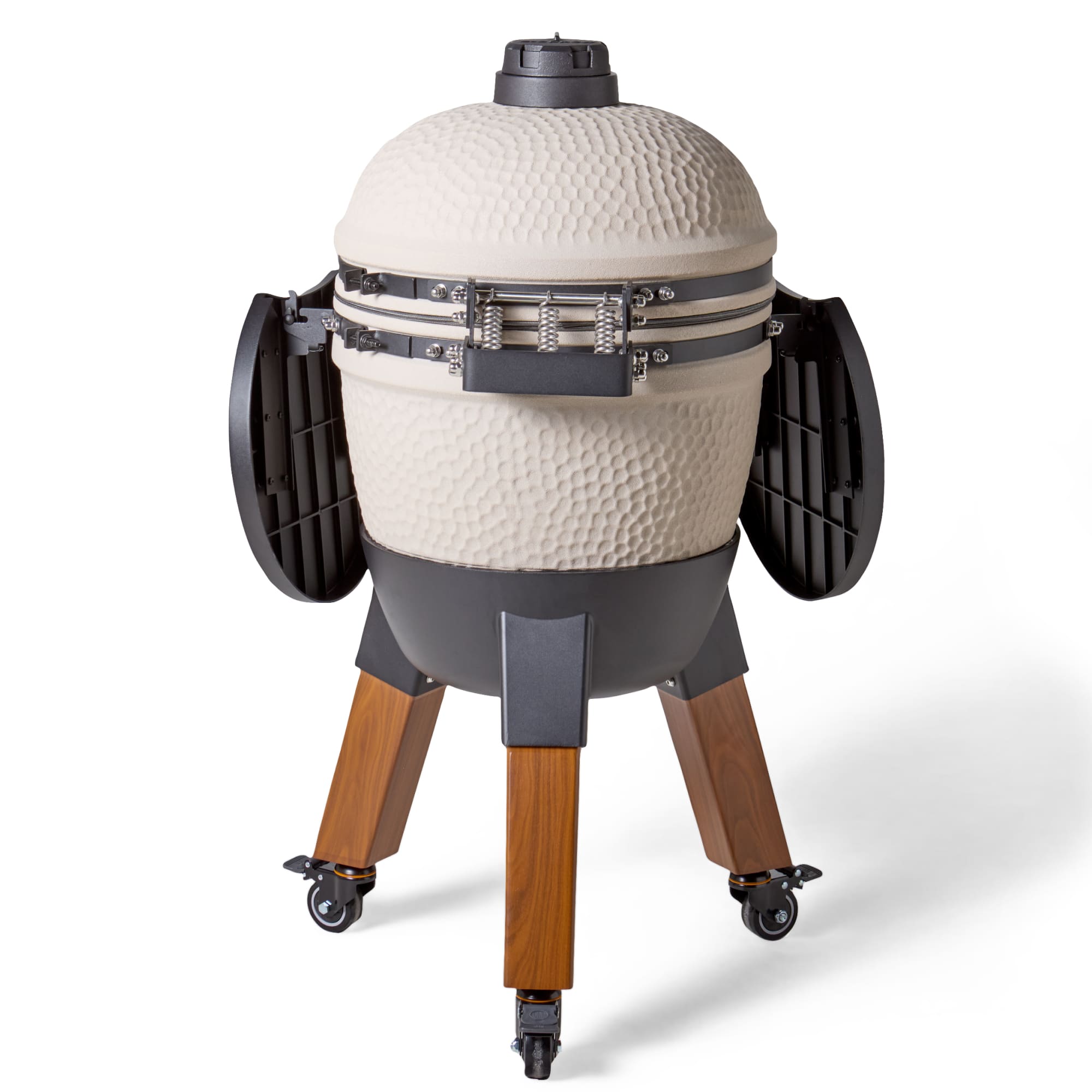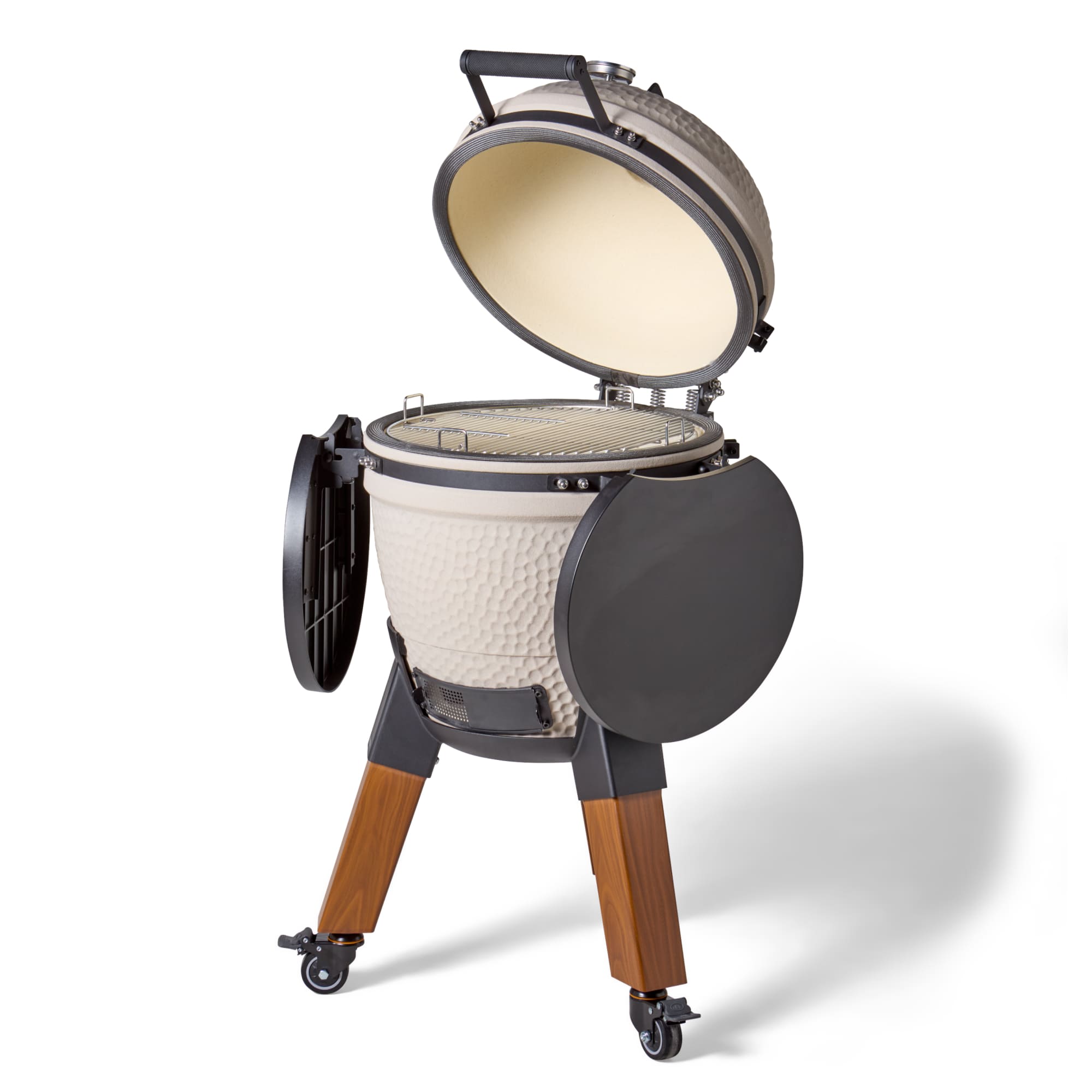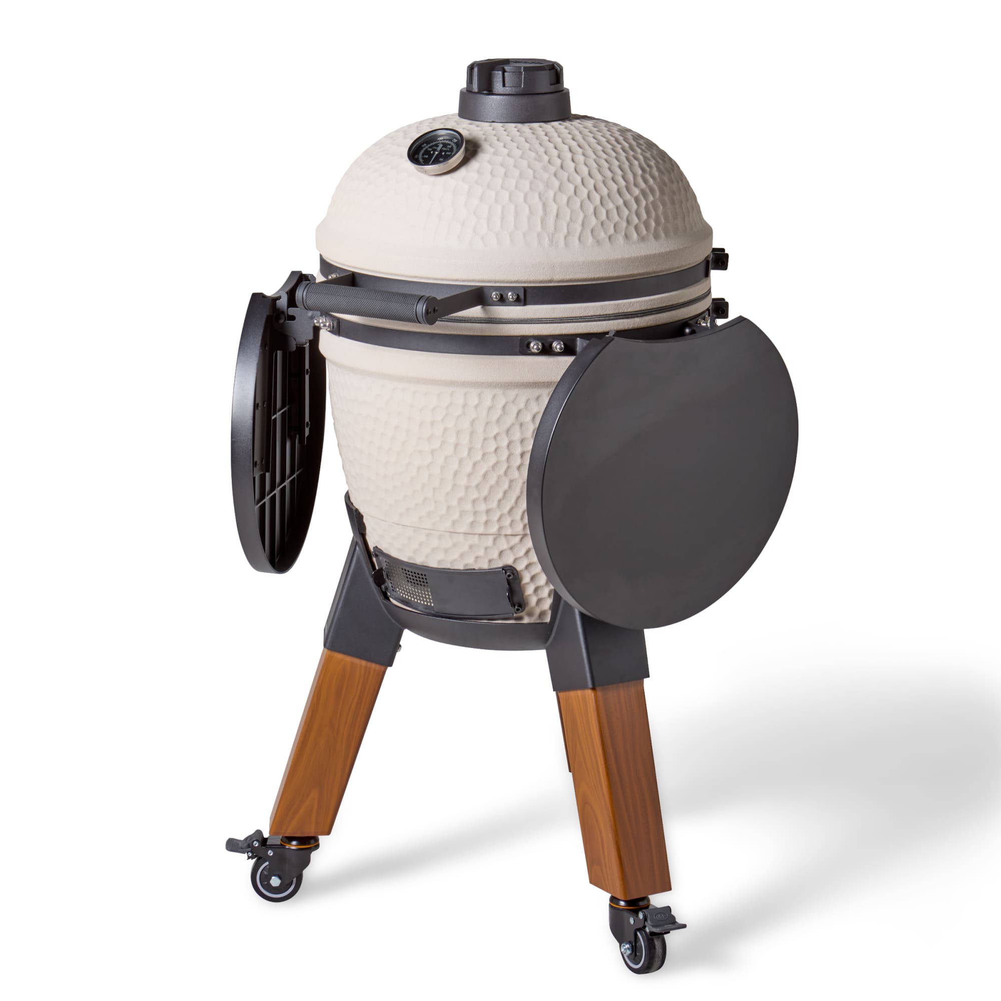 Deze uitvoering staat op aluminium hout-look poten en is voorzien van bijpassende zijtafels. De combinatie van natuurlijke uitstraling en moderne materialen zorgt voor een luxe en evenwichtig geheel. De wielen maken het mogelijk om de kamado eenvoudig te verplaatsen, terwijl de zijtafels extra werkruimte bieden.