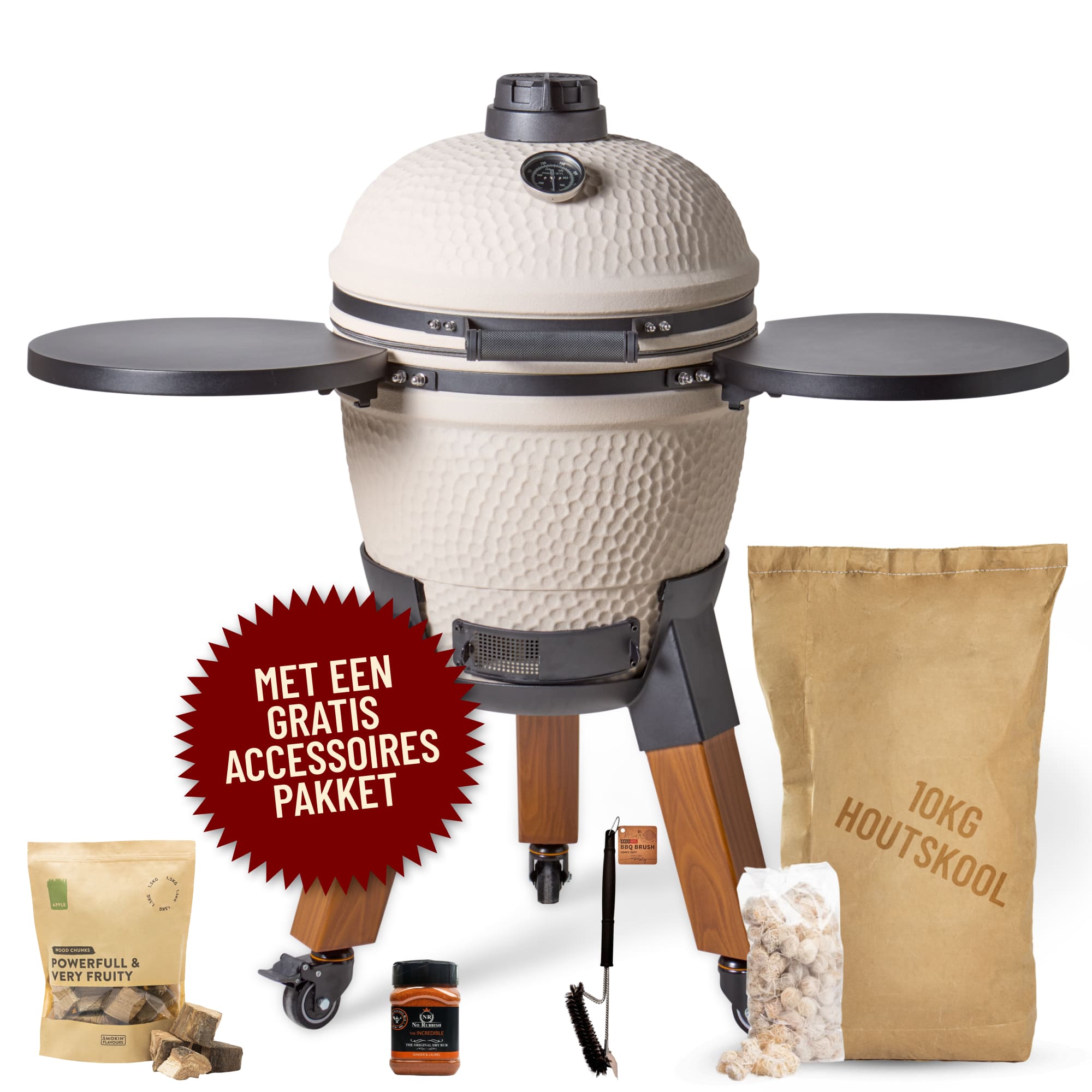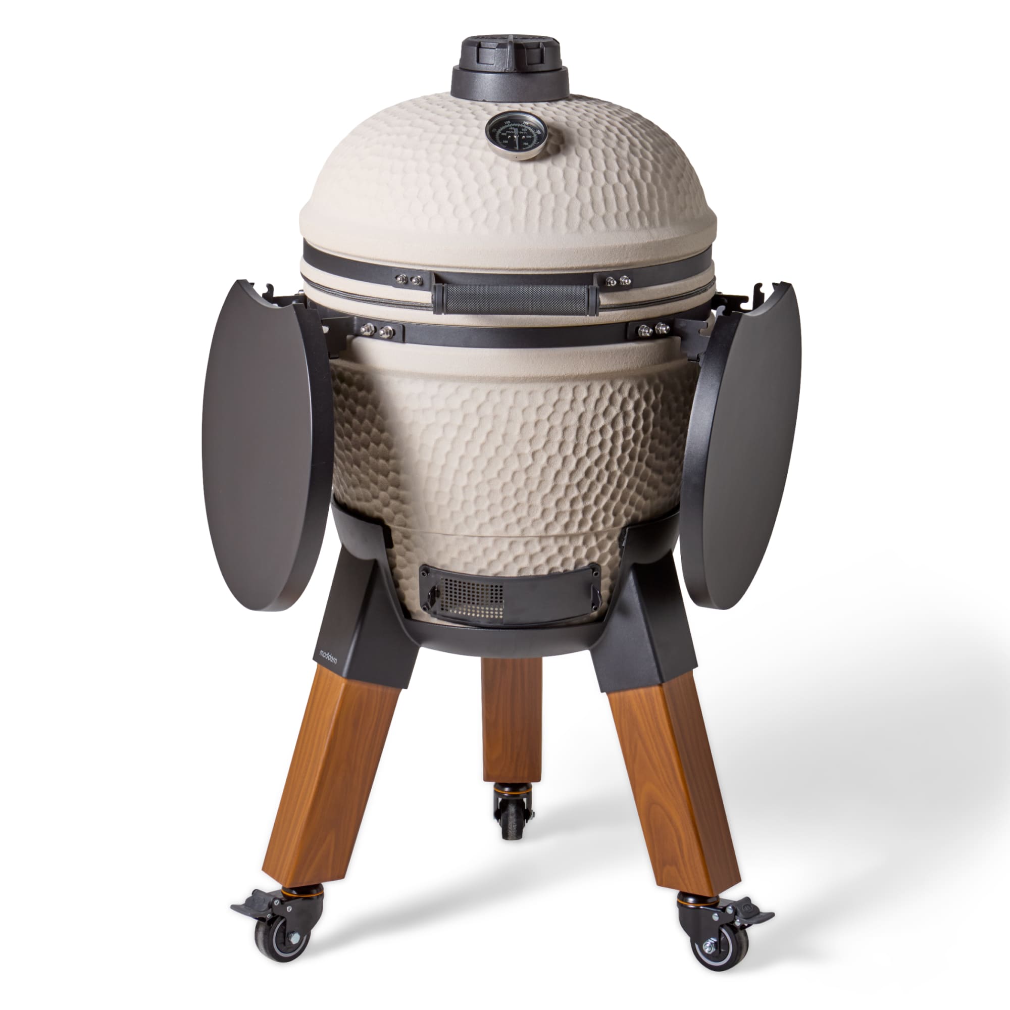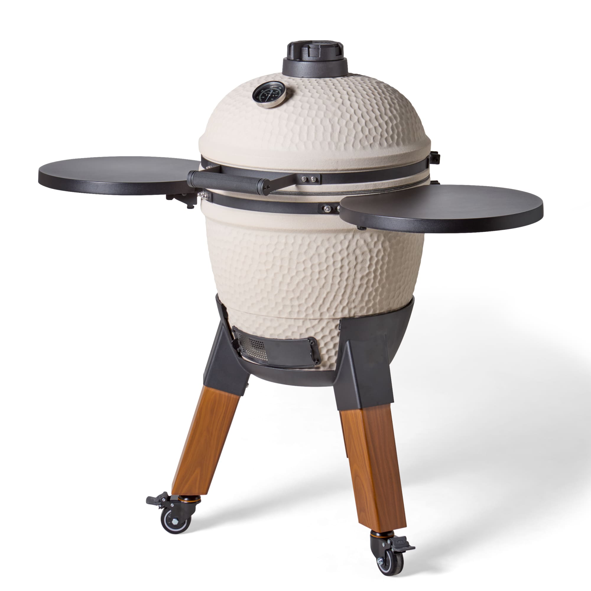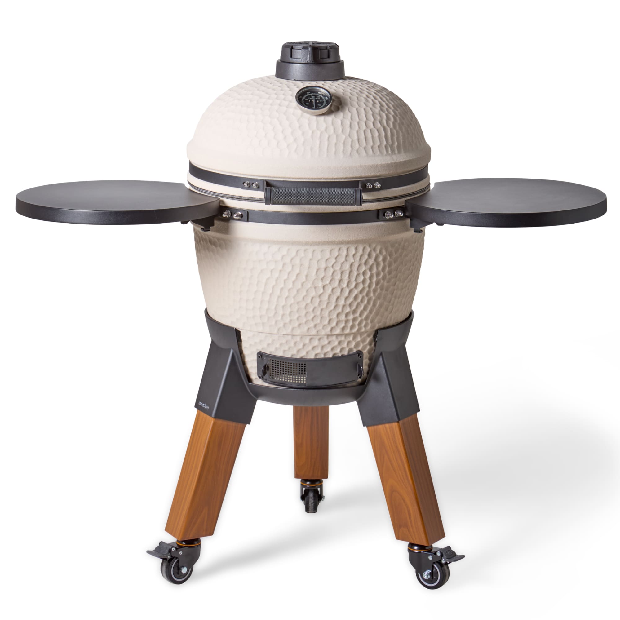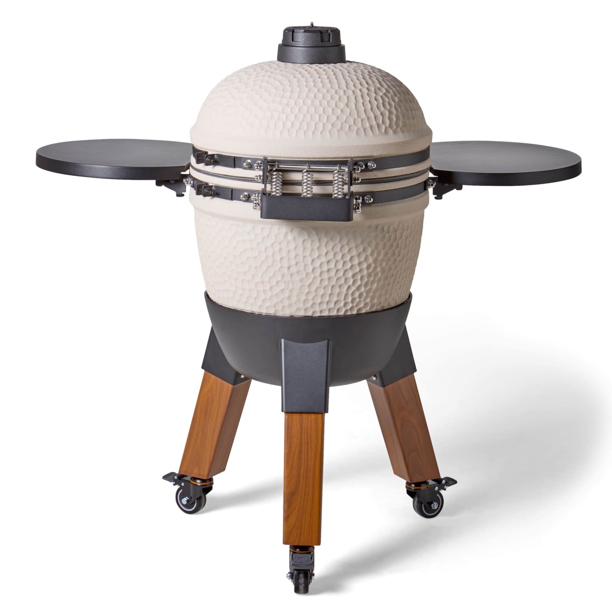 Deze uitvoering staat op aluminium hout-look poten en is voorzien van bijpassende zijtafels. De combinatie van natuurlijke uitstraling en moderne materialen zorgt voor een luxe en evenwichtig geheel. De wielen maken het mogelijk om de kamado eenvoudig te verplaatsen, terwijl de zijtafels extra werkruimte bieden.