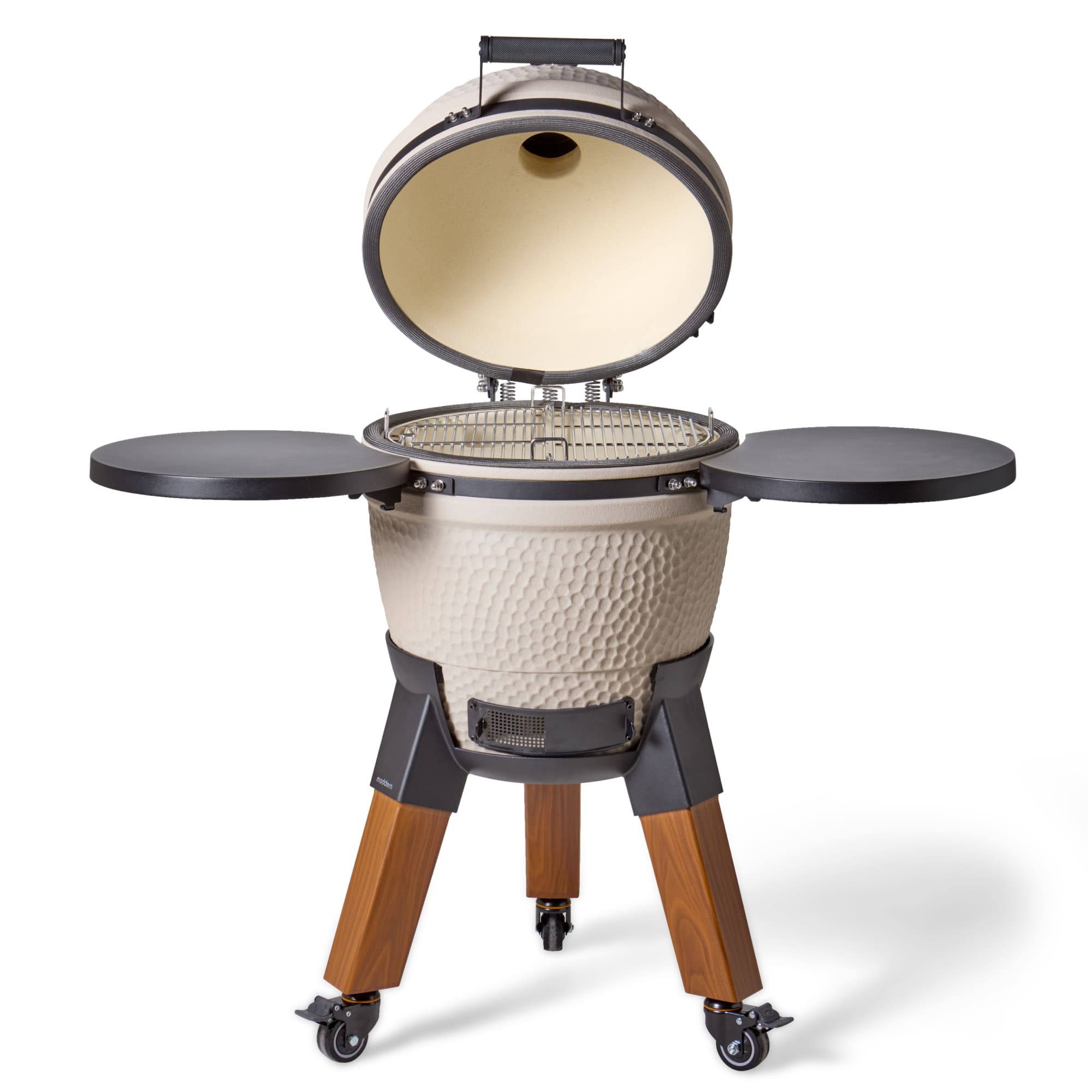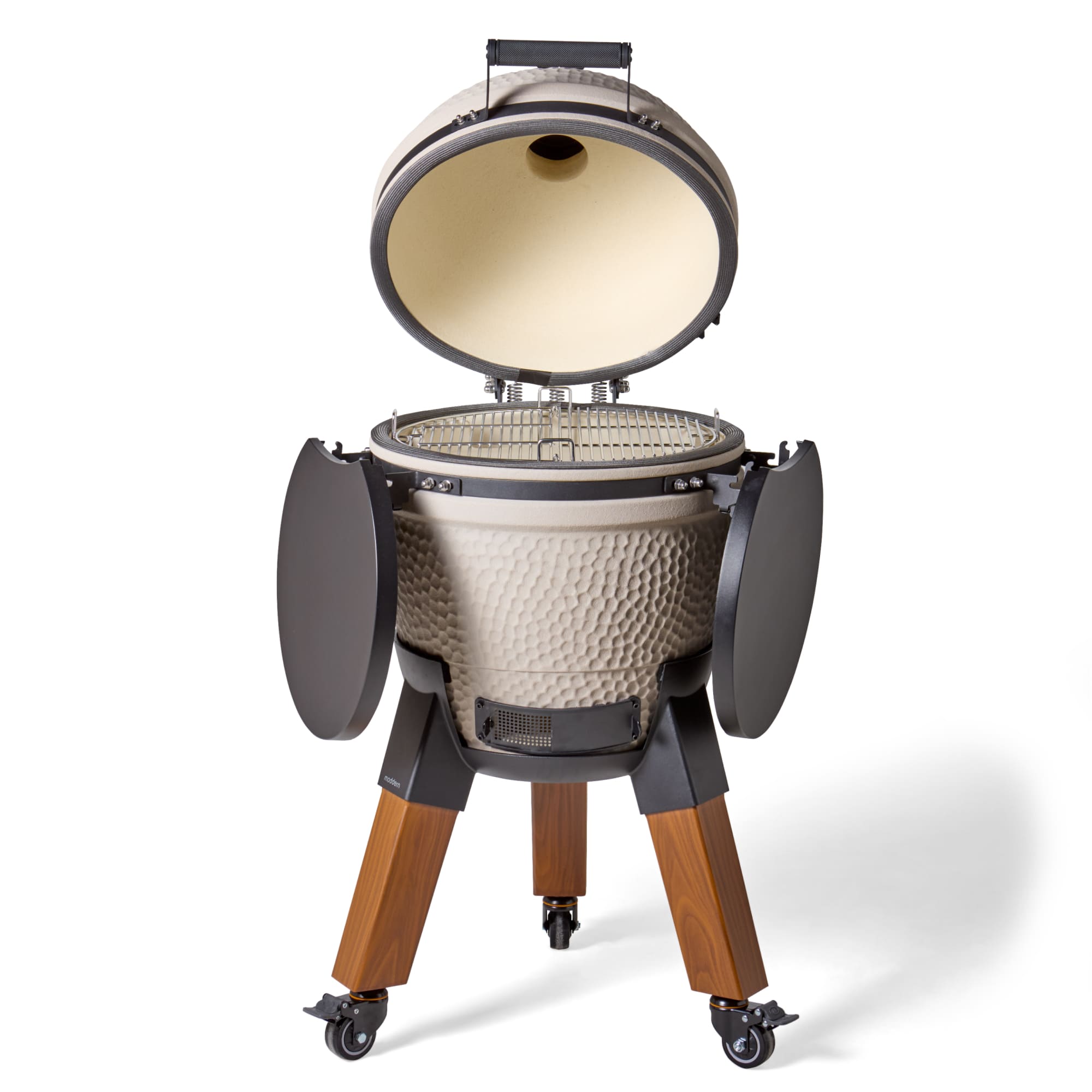 De Moddern Sandy Stone Special – Wood Look combineert de zachte, natuurlijke uitstraling van Sandy Stone met het warme karakter van hout-look details. Deze uitvoering is ontworpen voor wie buitenkoken ziet als een verlengstuk van zijn leefruimte en daarbij oog heeft voor materiaal, kleur en detail. De beige Sandy Stone keramische behuizing vormt een rustig en harmonieus geheel met de aluminium hout-look poten en de geïntegreerde zijtafels. Het resultaat is een kamado met een elegante, bijna meubelachtige uitstraling die perfect past in natuurlijke en mediterrane buitenruimtes.