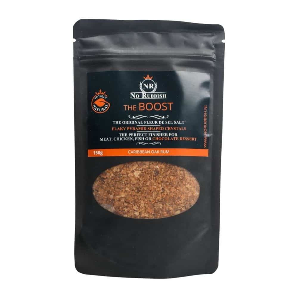 No Rubbish The Boost brengt de perfecte finishing touch aan je gerecht met de tedere verfijnde smaak van Fleur de Sel zout, gecombineerd met een krachtige, op eiken gerijpte Caribische rum. Dit product geeft de ultieme eindboost aan je culinaire creaties – probeer die maar eens te weerstaan! No Rubbish The Boost is 100% natuurlijk, waardoor je verzekerd bent van pure en authentieke smaken. Piramide gevormde kristallen De flaky piramidevormige kristallen van No Rubbish The Boost zorgen voor een luxe uitstraling en een subtiele textuur op je gerechten. Elke luxe sachet van No Rubbish The Boost is voorzien van een handige ziplock sluiting, waardoor de inhoud vers blijft en gemakkelijk te doseren is. Geniet van 150 gram van deze heerlijke finishing touch, klaar om je gerechten te verheffen tot ware culinaire hoogstandjes. Voeg een vleugje luxe toe aan al je gerechten met No Rubbish The Boost. Een absolute must-have voor elke chef!