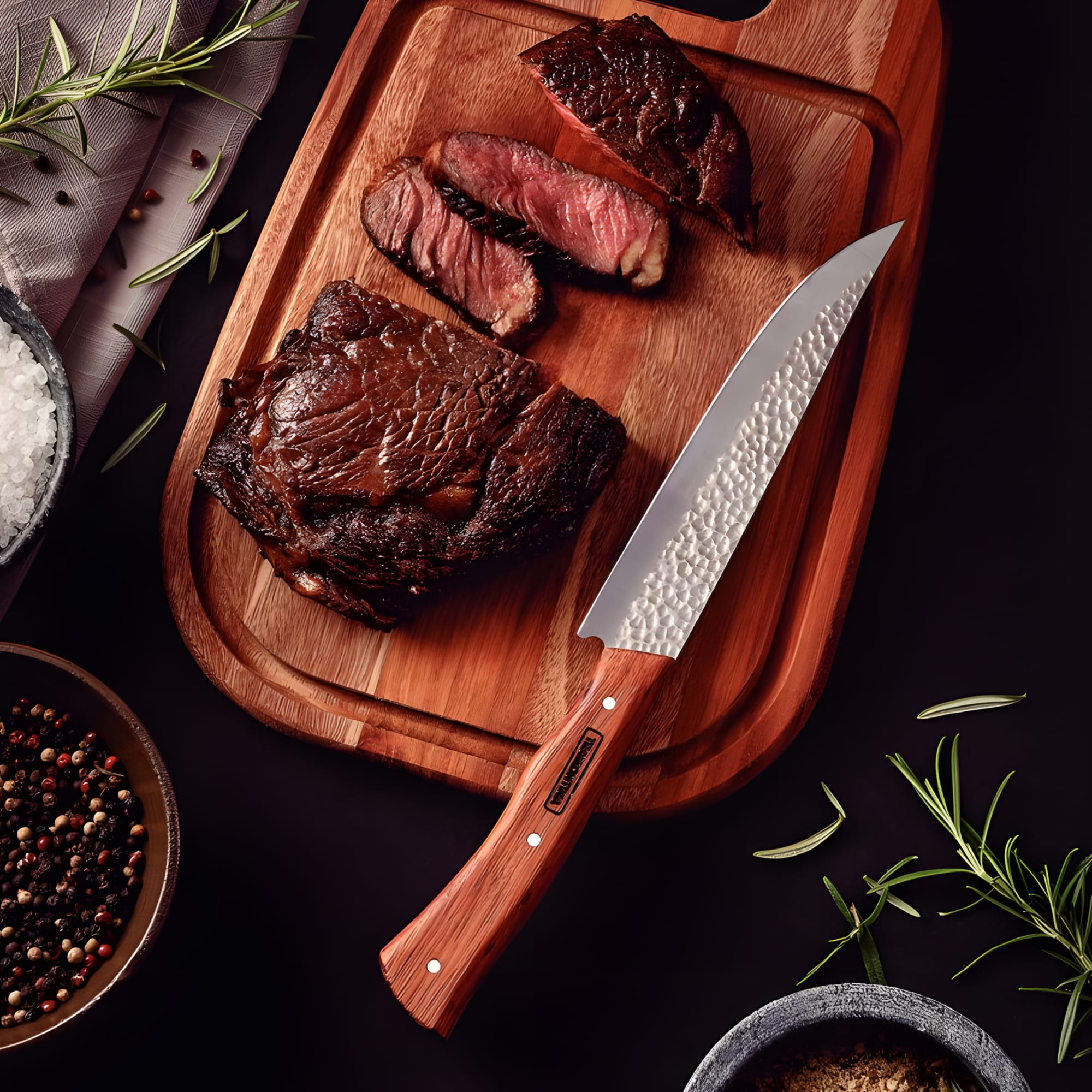 Het Tramontina Vleesmes 18 cm uit de Nômade-serie is een veelzijdig keukenmes voor wie houdt van precisie en kwaliteit. Het gehamerde lemmet snijdt moeiteloos door vlees en biedt de perfecte balans tussen precisie en kracht. Perfect voor het snijden van medium tot grote stukken vlees. De ergonomische houten handgreep is FSC-gecertificeerd. Het houten handvat zorgt voor grip en comfort. Dit mes biedt controle en precisie bij het trancheren en serveren. Een must-have voor iedereen die graag in de keuken staat. Of je nu houdt van BBQ of gewoon van koken.