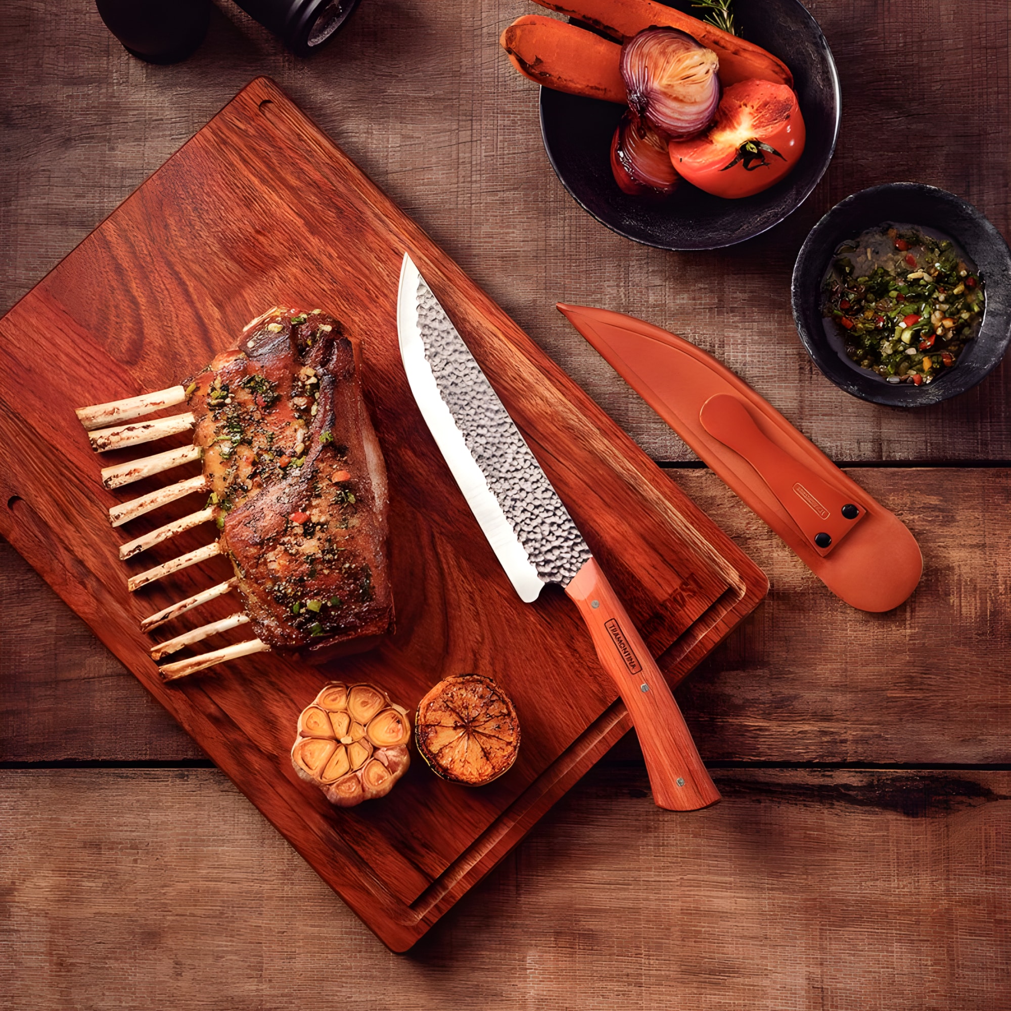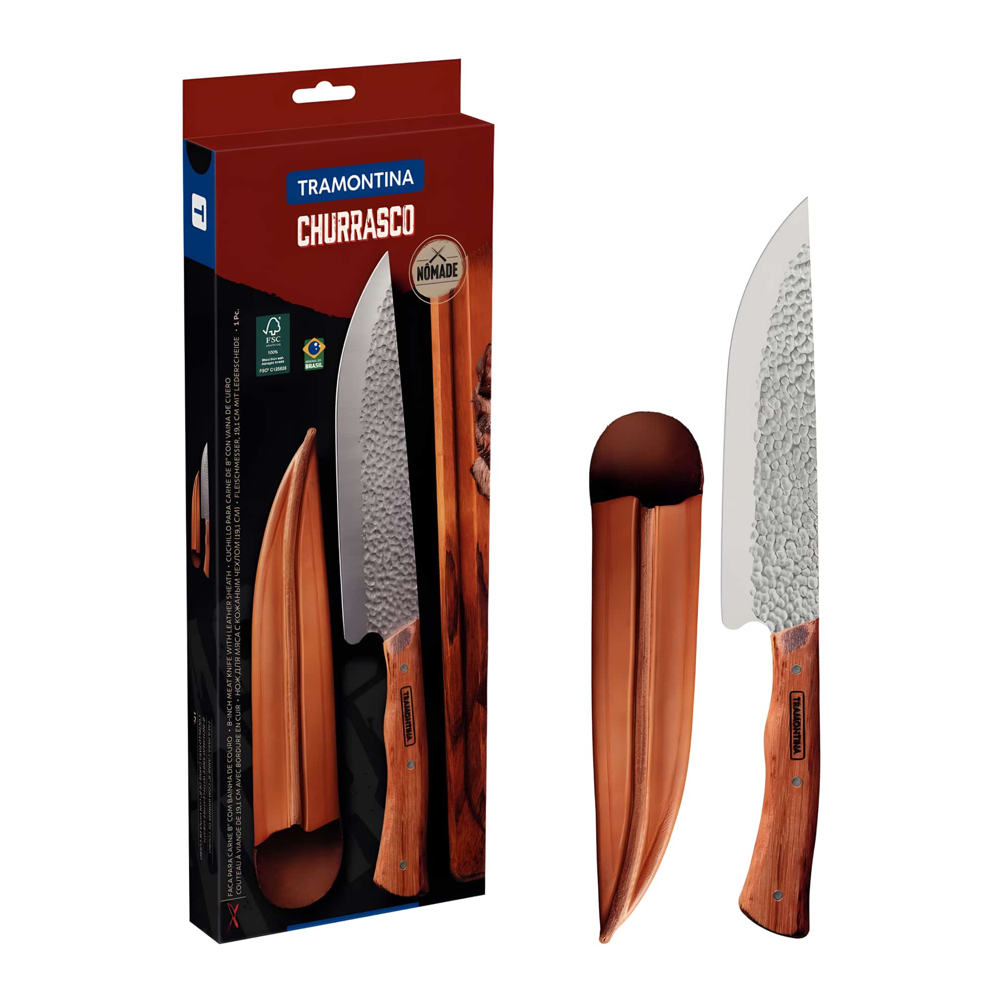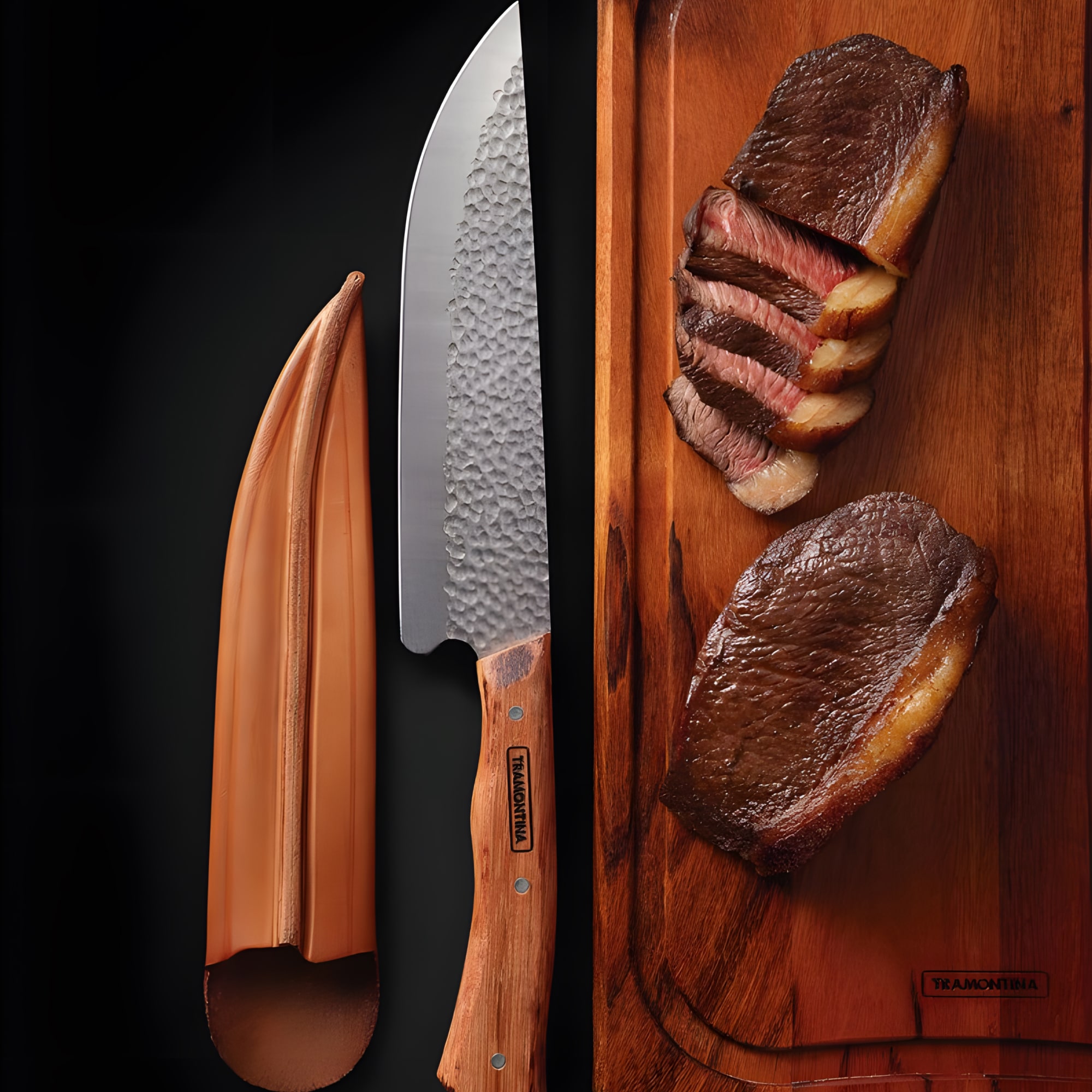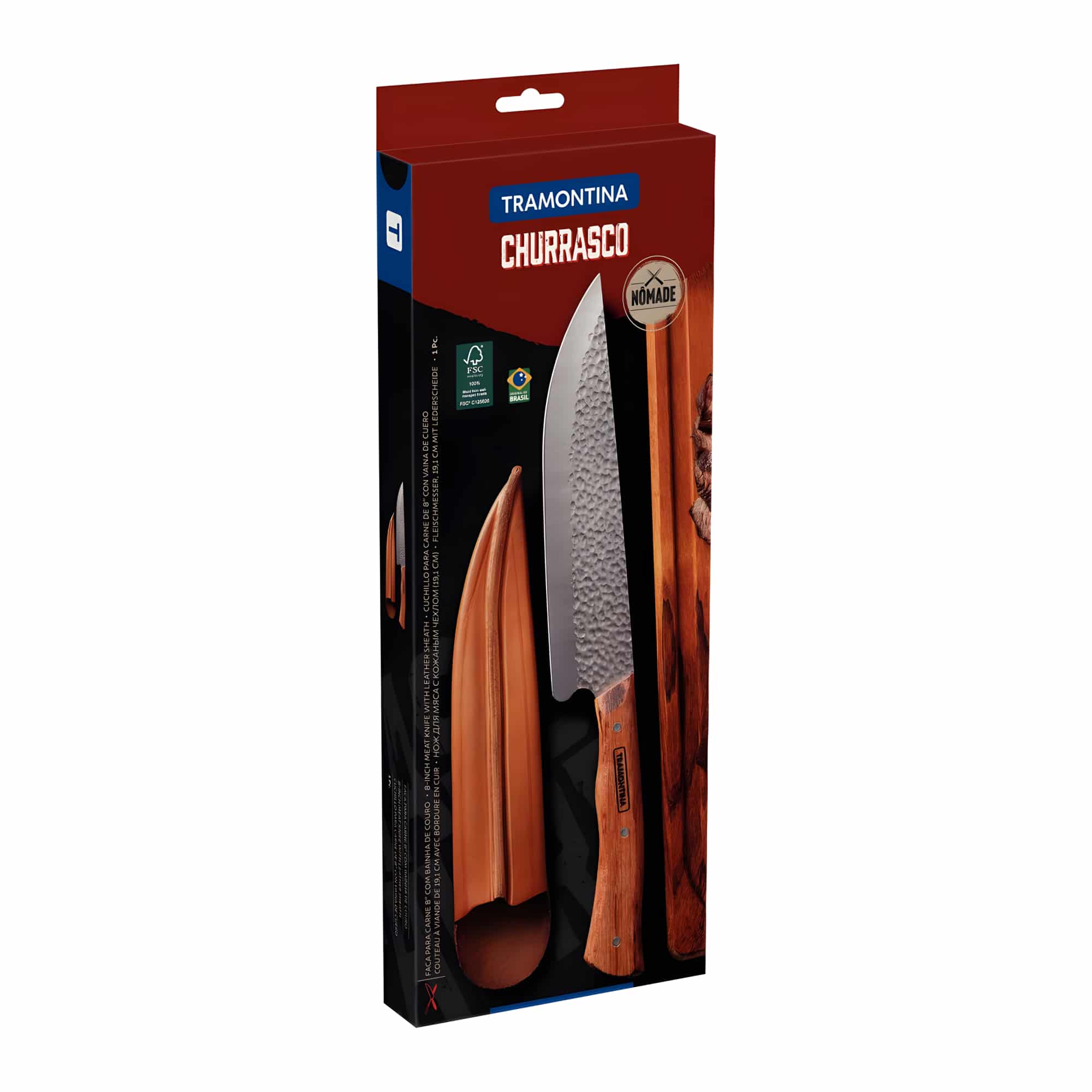Dit Tramontina Vleesmes met lederen houder combineert kracht, precisie en stijl. Het gehamerde lemmet van 20 cm is perfect voor het snijden van malse stukken vlees zoals ribeye, lamsrack of gevogelte. Het lemmet glijdt soepel door vlees en behoudt zijn scherpte, ook bij intensief gebruik. Het ergonomische houten handvat biedt optimale grip en controle, terwijl de meegeleverde leren houder zorgt voor veilig en stijlvol opbergen. Een prachtig mes voor iedere thuiskok, BBQ-liefhebber of vleesprofessional. Een must-have voor iedereen die graag in de keuken staat. Of je nu houdt van BBQ of gewoon van koken.