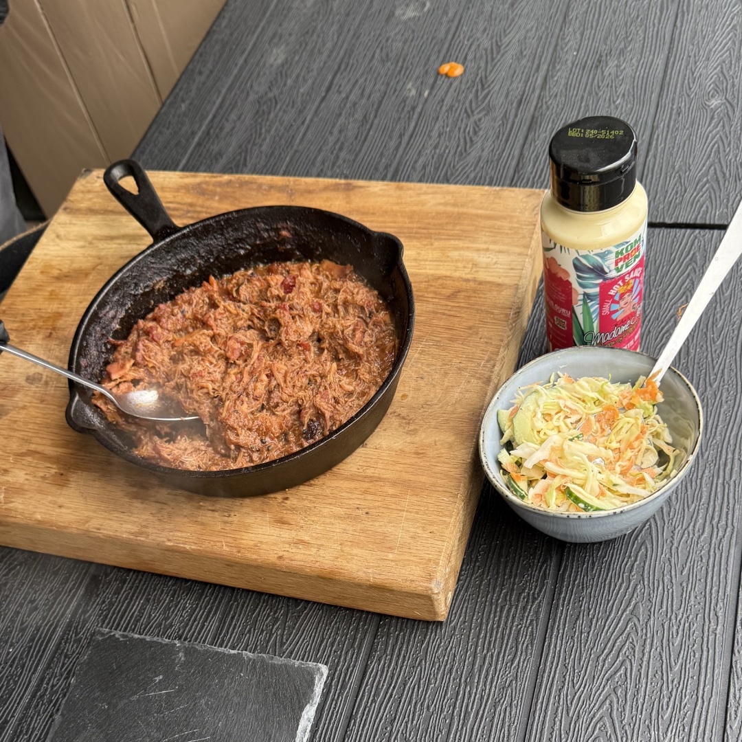 De salade brengt frisheid en crunch, de kip is warm en rokerig, en de Madame Jeanette mayo zorgt voor pit zonder je mond te slopen. Dit is comfort food met finesse, en precies wat je wil als BBQ-streetfood-style op je eigen rooster.