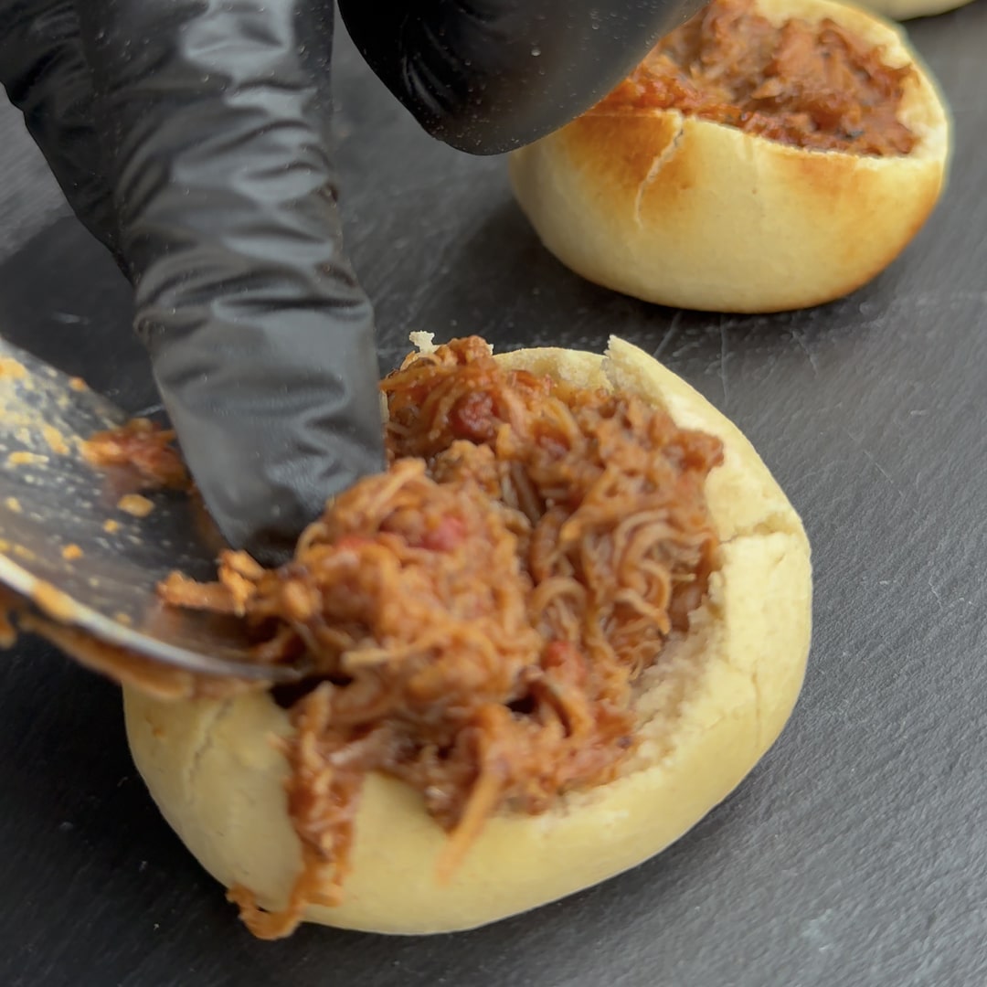Snijd de bovenkant van elke bao bun in, alsof je er een partje uithaalt. Zo ontstaat er een holte waarin je de pulled chicken mooi kunt leggen.