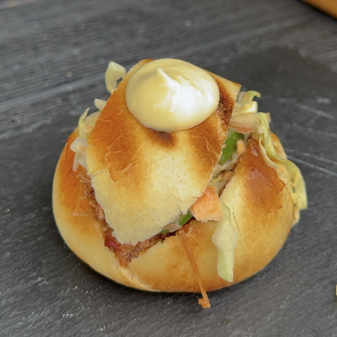 Dit is geen standaard broodje kip. Deze Bao Bun Pulled Chicken is een smeuïge, knapperige en licht pittige traktatie van de BBQ. Gegrilde bao buns gevuld met zelfgemaakte pulled chicken, een frisse salade van spitskool, komkommer en wortel, en als klapper een royale dot Saus.Guru Madame Jeanette mayo. Zacht brood, sappige kip en knapperige groenten: een perfecte bite.
